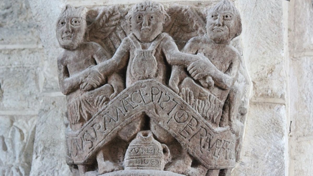 Sur la banderole se lit : CANDO VSURAM ACEPISTI OPERA MEA FECISTI (« En pratiquant l'usure, tu as fait selon mes ordres »). On date cette sculpture de la fin du 11e siècle...