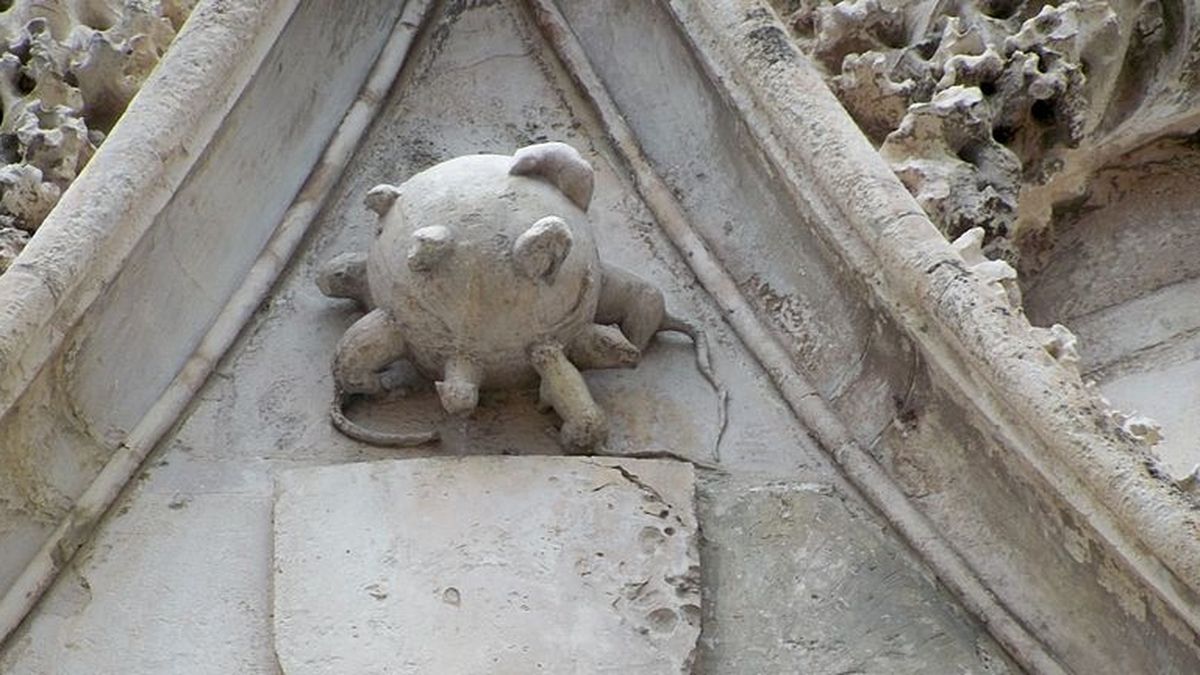 La boule | ©Véronique PAGNIER / CC-BY-SARegardez un peu ce détail, sur le fronton de la célèbre porte Juive : cette sculpture bizarre, la « boule aux rats », boulo di gari en provençal.