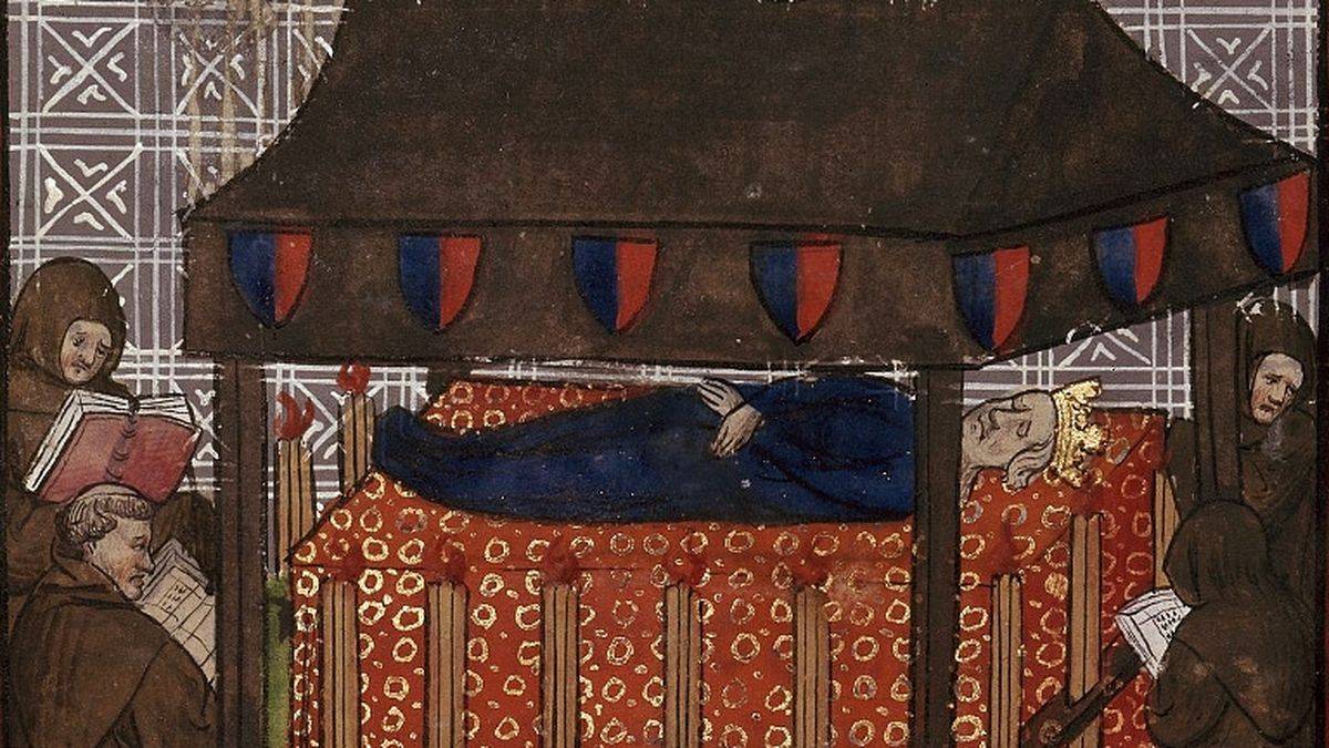 Funérailles de J. de Navarre (Chroniques de France, 1380) | ©The British Library / Public domainJeanne de Navarre, 32 ans, vient de mourir au château de Vincennes. On est le 2 avril 1305.