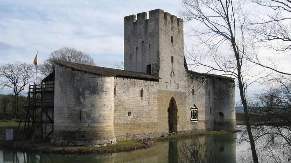 Un donjon-porche haut ici de 20 m sur 5 étages, flanqué de 2 corps de logis protégés par de profonds fossés !
