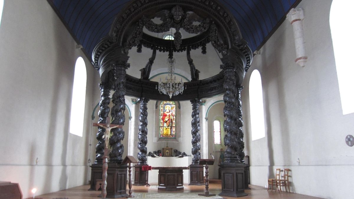 La voilà, la surprise : le baldaquin ! Un baldaquin sert de décoration à l'autel, formant une sorte de dais posé sur des colonnes. Celui-là, typique de l'art baroque, date du début du 17e siècle, initialement commandé pour l'église du couvent des Cordeliers de Châteauroux.